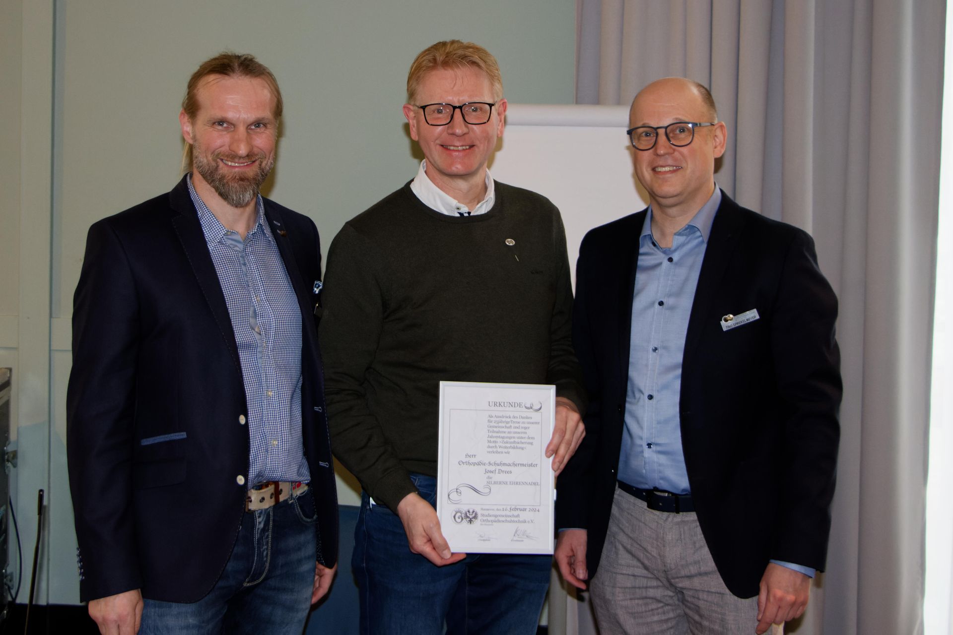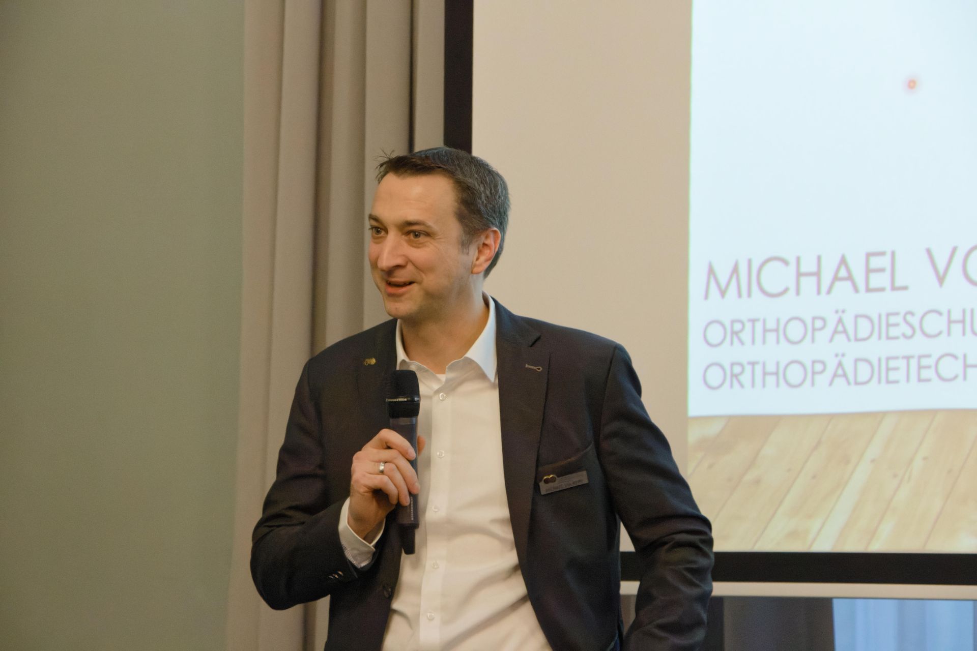 Die neue Sitzordnung war zunächst etwas fremd, aber wer bei der Coronatagung 2022 dabei war kann sich noch daran erinnern, dass der Saal schon einmal quer stand. Dieses Konzept hat das Remarque als Vienna House Hotel jetzt übernommen und so haben wir zwei Leinwände und zwei Beamer gleichzeitig bespielt. Inhaltlich ging es aber, wie immer, gleich in die Vollen. Am Vormittag des ersten Tages drehte sich alles um die Versorgung von Sportlern und Überlastungsbeschwerden. Vor der Mittagspause stand dann, wie in den vergangenen Jahren auch, die Ehrengastlecture auf dem Programm. Dieses Jahr hatten wir die Freude Prof. Dr. P. Lobenhoffer zu ehren und der einen Vortrag über die Auswirkungen von Achsdeformitäten auf Knie- und Sprunggelenk hielt. Besonders beeindruckend dabei war, dass mehrere Osteotomien ein Fehlstellung wieder korrigieren können und damit sogar die „Selbstheilungskräfte“ des Körpers aktiviert werden. Prof. Lobenhoffer ist Vizepräsident der GOTS (Gesellschaft für Orthopädiesch-Traumatoloische Sportmedizin) und leitender Arzt der go:h in Hannover. Aber auch die weiteren Themen des Freitags waren hören- und sehenswert. Dabei haben wir immer versucht zwischen medizinischen und handwerklichen Vorträgen zum Thema zu wechseln. Denn der interdisziplinäre Austausch und der gegenseitige Respekt sind wichtiger den je um eine gute Versorgung und das Bestmögliche für den Patienten zu erreichen. Dies unterstrichen auch die Referenten aus der Ärzteschaft, allen Voran Prof. Dr. M. Engelhardt, der sich wie immer um die Auswahl der medizinischen Vorträge gekümmert hat, und der Präsident der D.A.F. (deutschen Assoziation für Fuß und Sprunggelenk e.V.), Dr. J. Dohle.Am Samstag ging es dann mit aktuellen Behandlungsmethoden bei DFS und ausgeprägten Fuß- und Sprunggelenksdeformitäten weiter. Dieser Block wurde von Prof. Dr. B. Greitemann und Prof. Dr. V. Valderrabano souverän von zwei bekannten Gesichtern in Osnabrück vertreten. Neu war OSM L. Lelgemann, der über die orthopädieschuhtechnischen Versorgungsoptionen berichtete. Im 6. Block wurde es dann technisch, als es um die neusten Einsichten bei der SMFO (Sensomotoric Foot Orthesis) ging. Nach der Mittagspause stellte dann Dr. A. Kerkhoff die aktuellen Entwicklungen im KomZet O.S.T. vor und leitete zum Open Space über, der sich mit dem Thema „Gemeinsam Zukunft Gestalten“ grundsätzlichen Fragen des Orhtopädieschuhmacherhandwerks stellte.